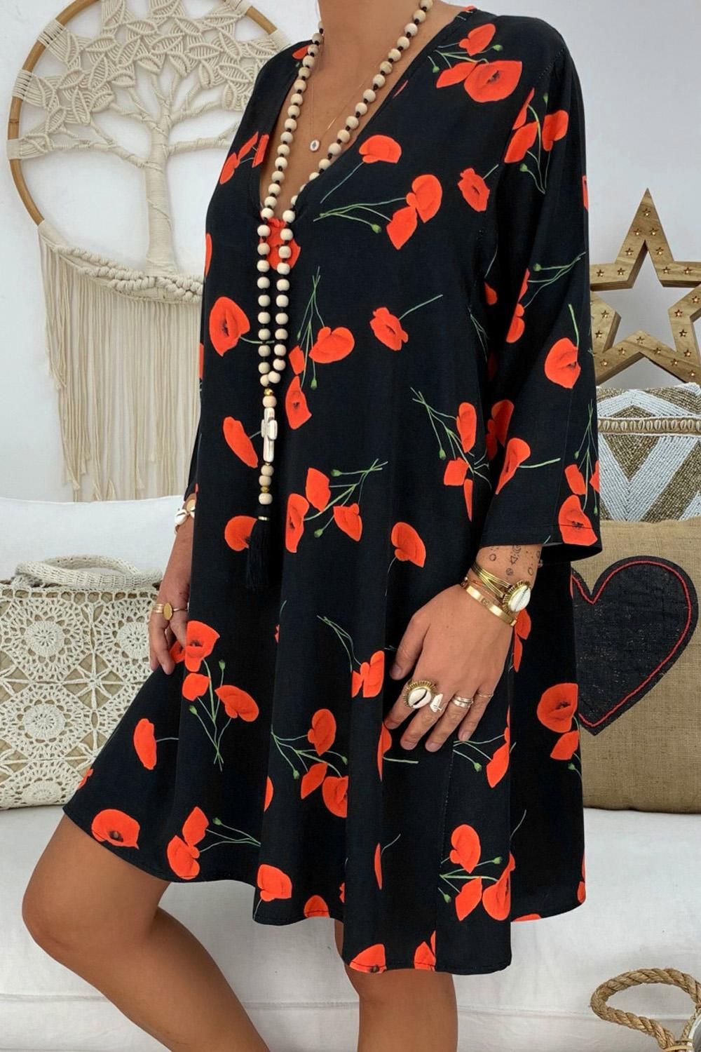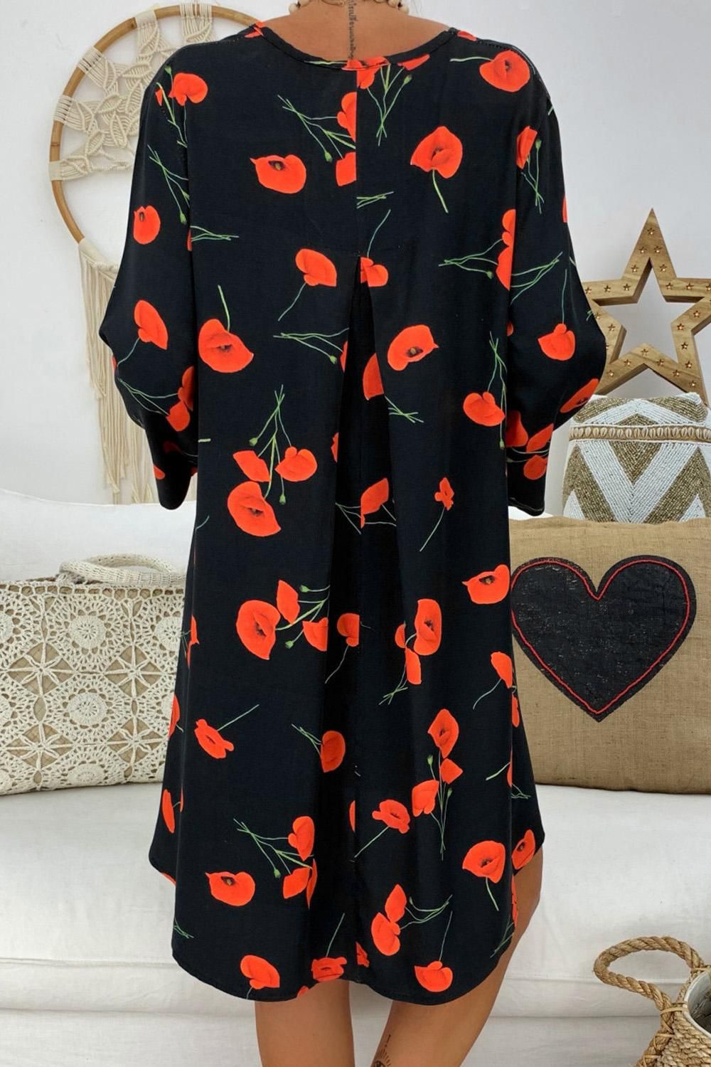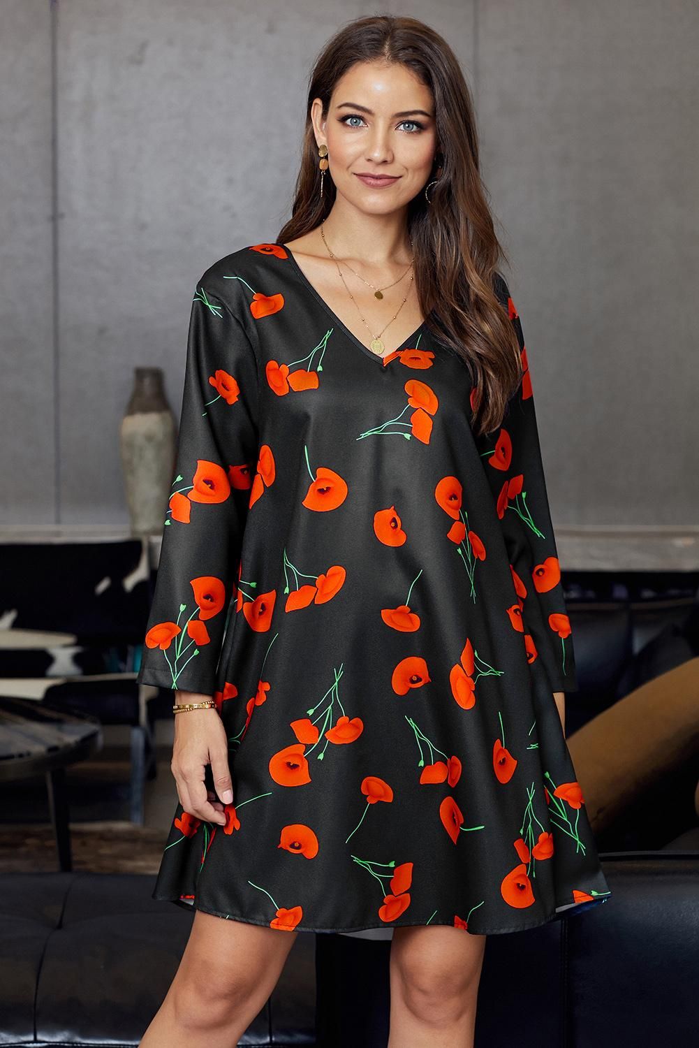 Black Printed V-Neck Three Quarter Sleeve Loose Dress