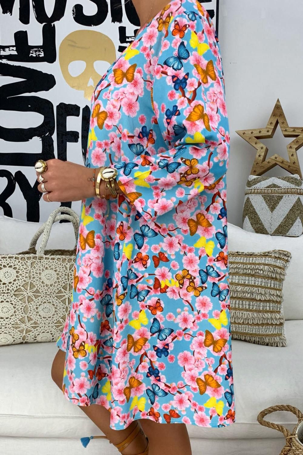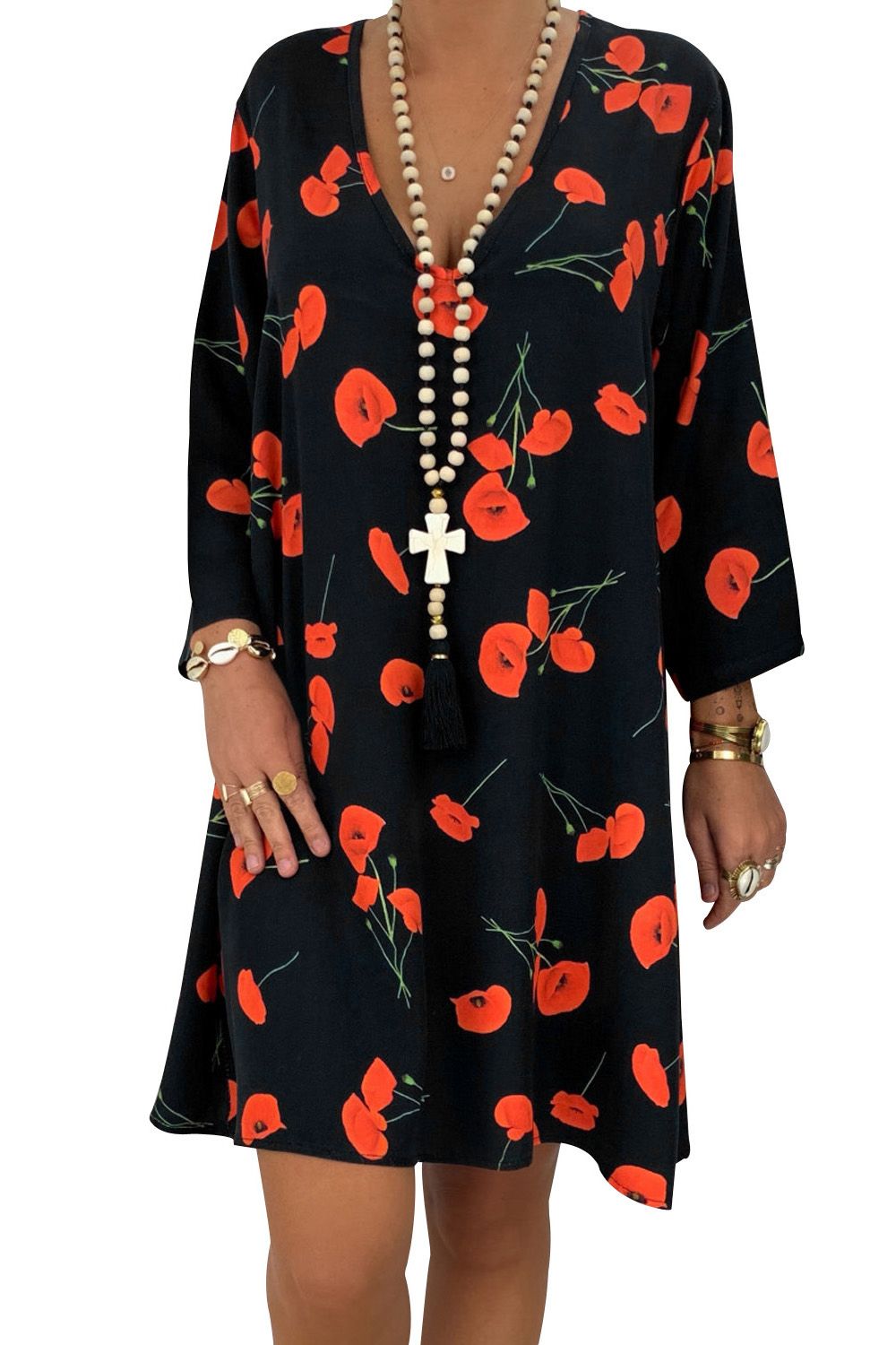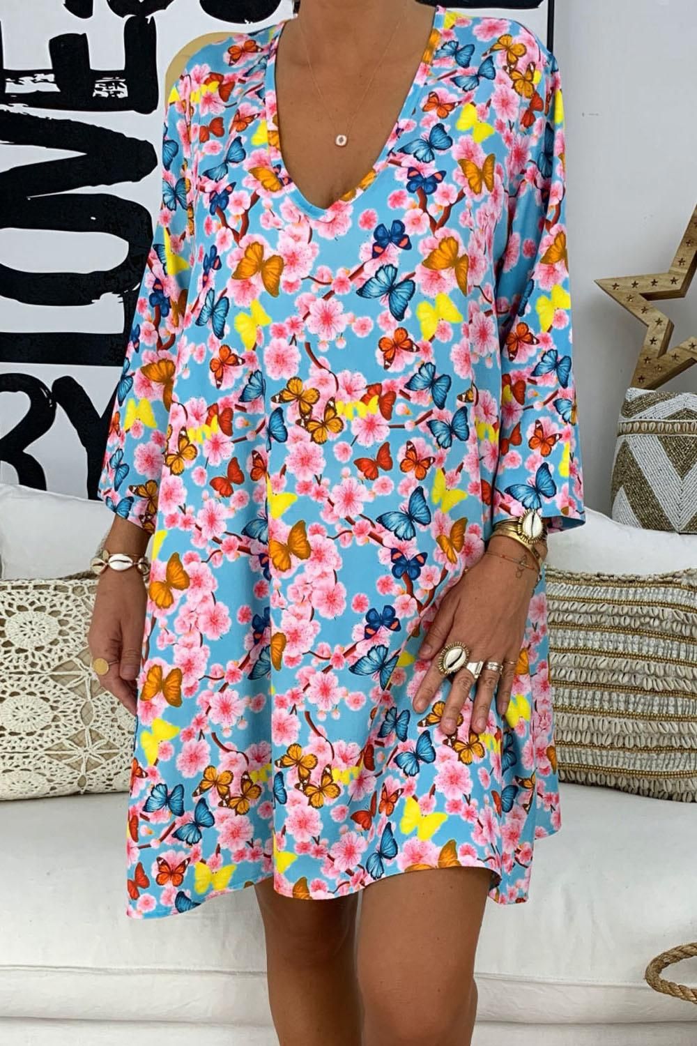 Black Printed V-Neck Three Quarter Sleeve Loose Dress
