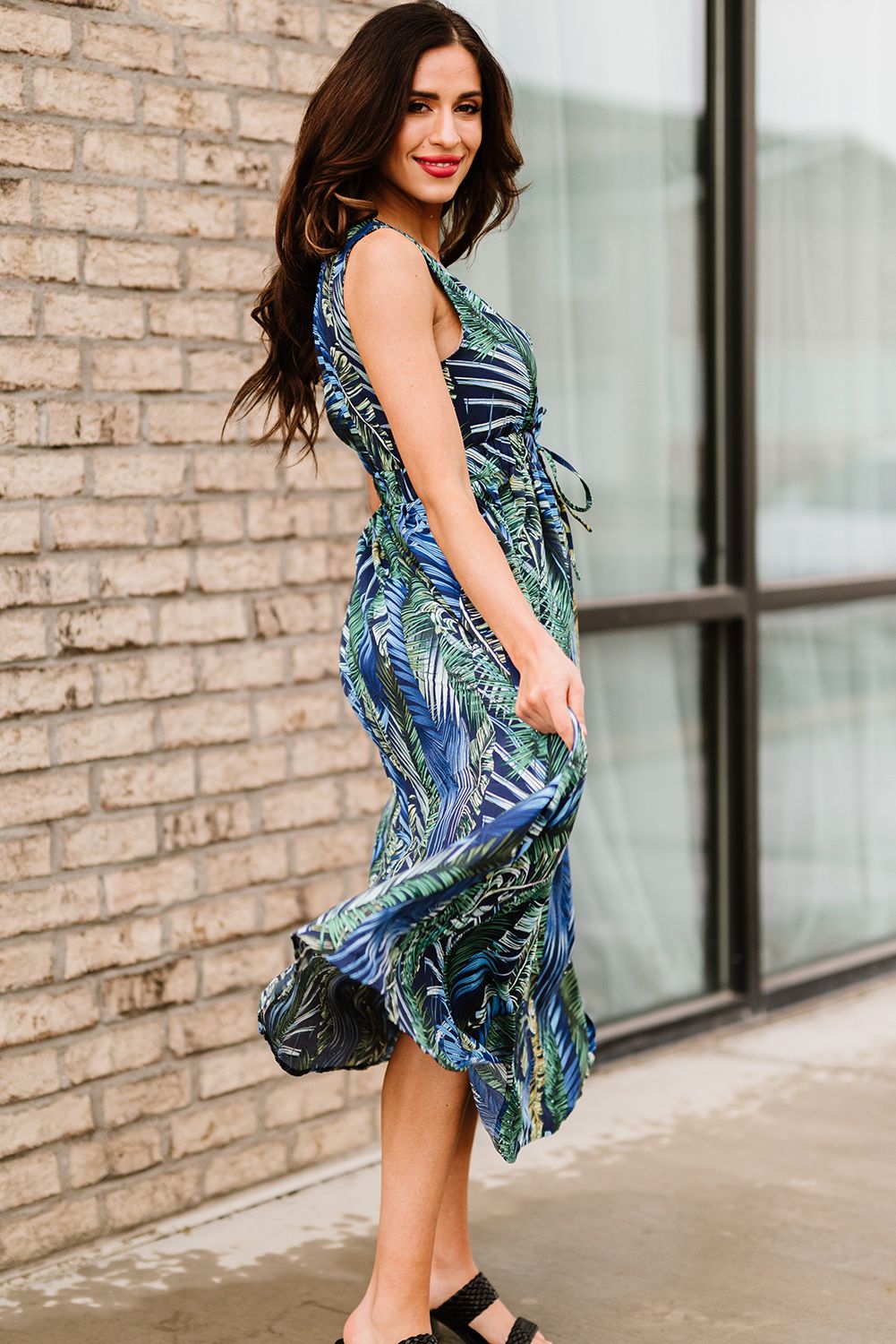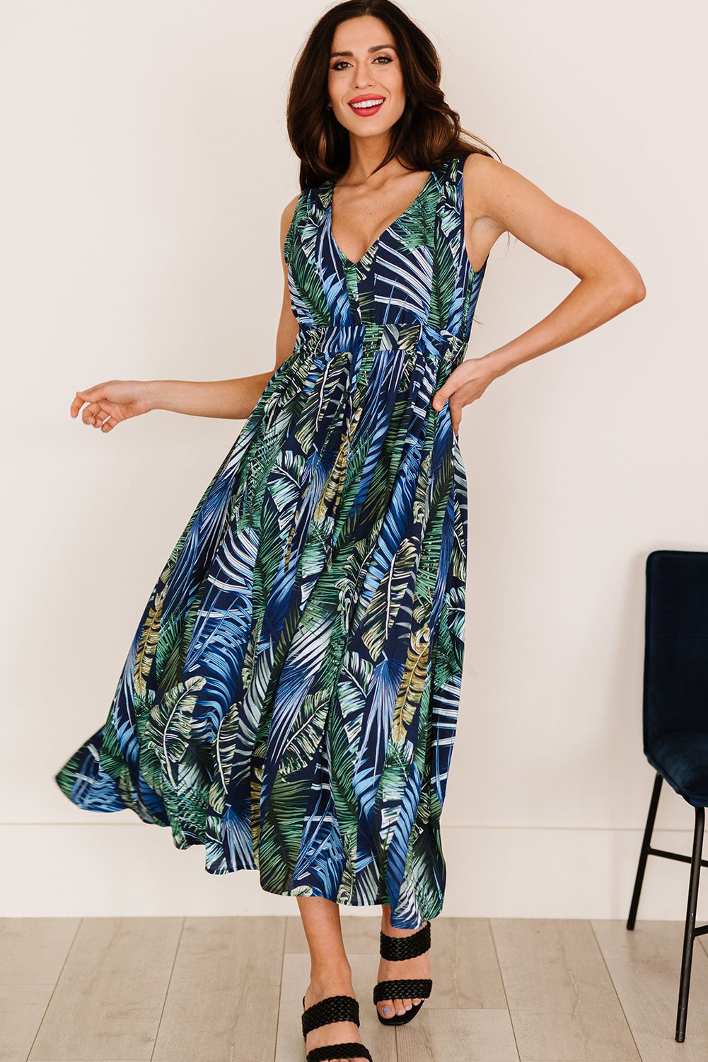Green Floral Printed V Neck Open Back Sleeveless Maxi Dress