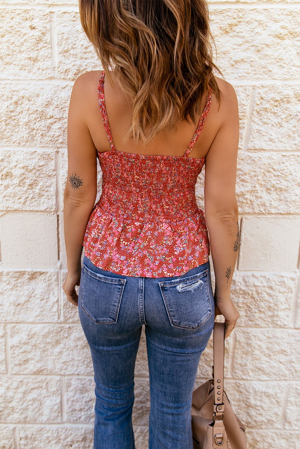 Red Floral Print Smocked Flounce Spaghetti Strap Camisole